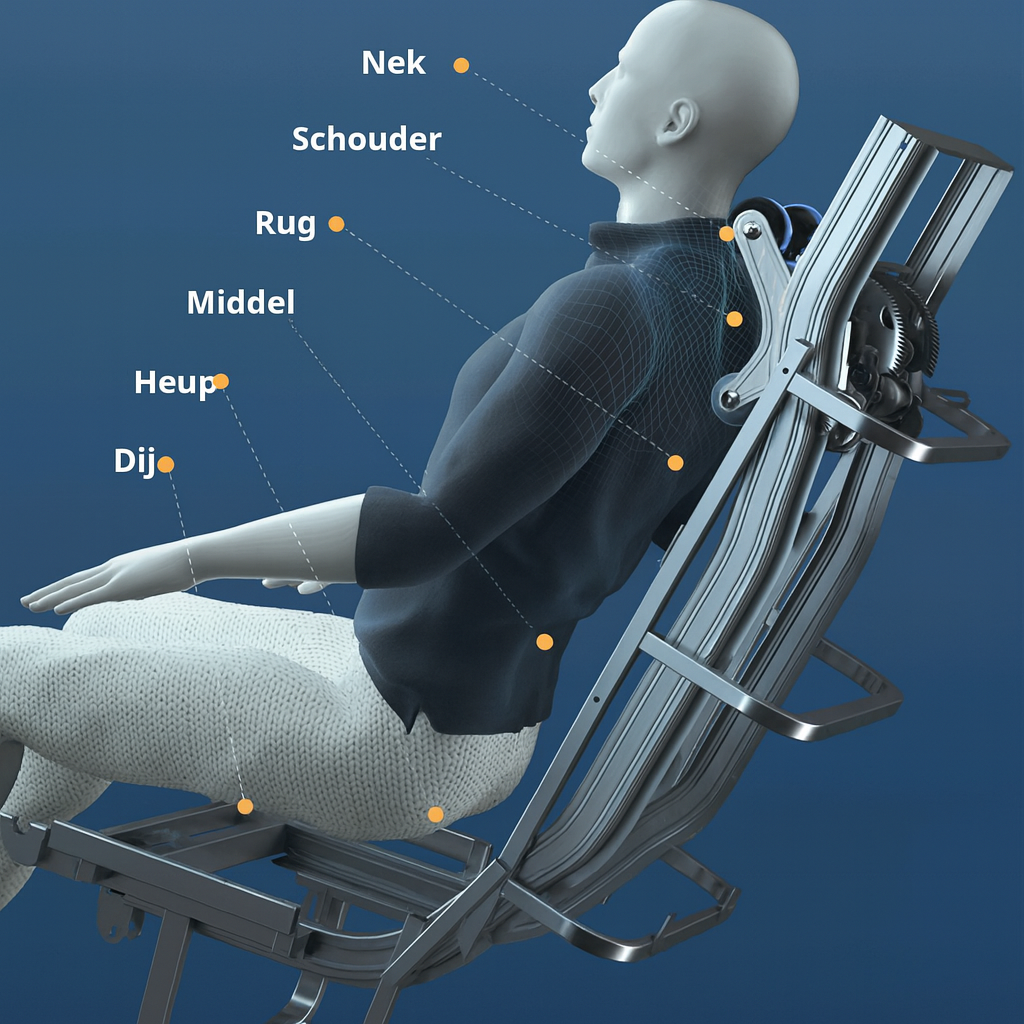 De Zero Gravity-positie plaatst je lichaam in een optimale houding waarbij je wervelkolom volledig wordt ontlast. Dit vermindert druk op spieren en gewrichten en verhoogt het gevoel van gewichtloos comfort.